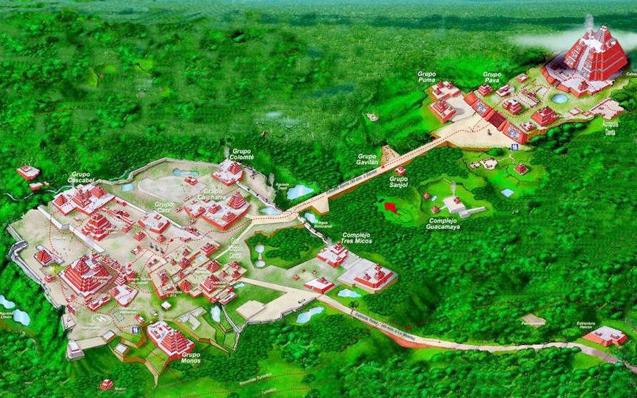 These three cities were linked by raised roadways called “sacbeob” built of stone and plaster, creating a network of white causeways through the jungle. Within each city, sacbeob led from one complex to another, providing a level walkway rising 18-20 feet above ground level and some 60-150 feet wide. The remnants of these causeways still provide level walking surfaces, now traversed by tree roots but cleared of brush by site workers.