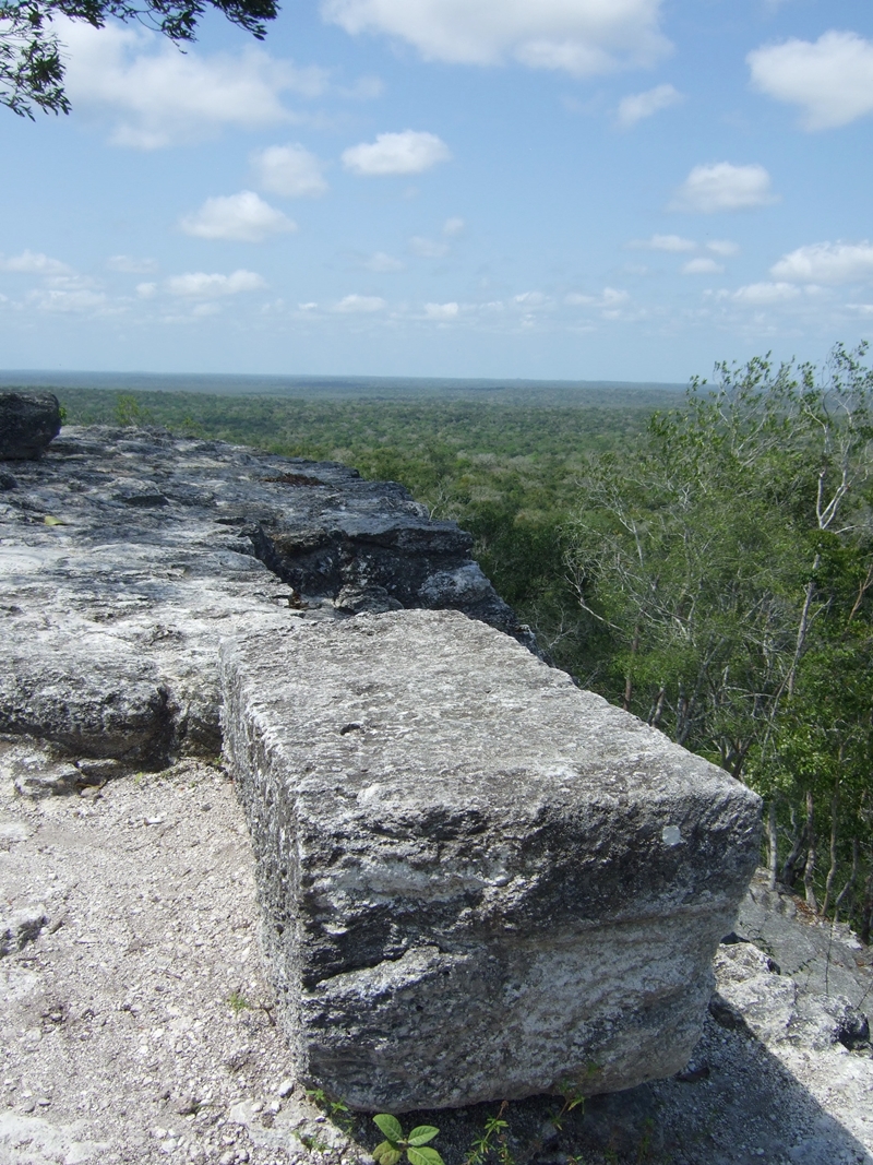 Climbing switchback wooden stairs with handrails, we ascended to the top of La Danta and gazed across miles of jungle stretching 360 degrees to all horizons. A light wind cooled our over-heated bodies as we rested thankfully on large square stones. Two geodesic markers gave coordinates for the summit. In the distance the mounds of Nakbe and La Tintal were visible as forested hills. It was heady to be standing atop the reputed largest pyramid in the world. A sense of the expanse and inter-connectedness of the ancient Maya world created feelings of awe.