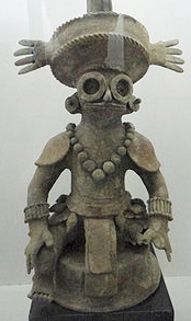Teotihuacan battle dress wearing the “goggle-eye” mask typical for the god Tlaloc. He was buried in a rich grave inside Temple 16, and his image has first position in the carvings on Altar Q showing 16 rulers of Copan. His descendants attributed Teotihuacano heritage to their founding ruler. Yax K’uk Mo’ possibly accompanied Siyaj K’ak in the earlier invasion of Tikal as a youth, and continued to spread Teotihuacan’s reach to important jade sources in the Motagua River region. He installed a vassal who had traveled with him, named Tok Casper, at nearby Quirigua. Both these settlements lie on the river network leading from the Motagua Valley to the Caribbean Sea. This gave links for Teotihuacan to control the jade trade.